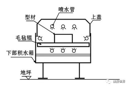 过水槽冷却是纵向用固定围板、两端用活动围板组成一个水槽,用低压水泵往水槽注水,型材穿过水槽进行冷却。过水槽冷却时,水与高温型材的表面接触,瞬间形成水汽膜,水汽膜将型材表面和冷却水隔开。由于水槽的水流动速度不大,水不能及时冲破水汽膜,所以造成冷却速度不如喷淋冷却和驻波冷却的强。过水槽冷却不能进行周向方向性调节,所以对异型材进行冷却时,变形量会比较严重,但能耗也比较低。适合管材、棒材、板材的淬火,选择该冷却形式牵引机不能到挤压机口牵引。