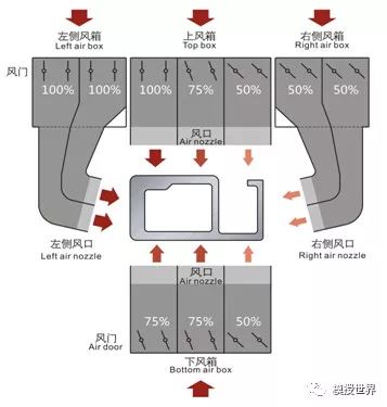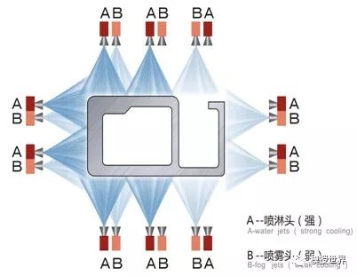 型材截面的径向和型材的纵向只有冷却速度基本一致,才能确保型材淬火效果基本一致,从而保证型材性能的均匀性,有效减少型材的变形和弯扭。要保证型材截面径向的冷却速度一致,就要保证截面径向冷却强度能够根据型材截面结构情况、壁厚的厚薄进行调节。比如壁厚较厚的一侧需要冷却强度高,壁厚较薄的一侧则需要冷却强度低些,这样就可使得型材截面同一时间内冷却到相同的温度。而要保证型材纵向的淬火强度一致,就要保证纵向上所受的冷却时间一致,也就是纵向上每部分通过淬火区的有效时间一致。