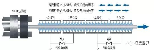 挤压换棒过程,全部立刻停止或全部继续保持冷却喷淋都不是理想的方法,这样会造成型材纵向的机械性能不一致和弯曲变形。每一路喷管的纵向分为两段,并用气动阀控制顺序启闭。换棒停止挤出时,从冷床往挤压机方向按次序关闭这两段喷管;换棒后开始挤出时,从挤压机出料方向按次序开启这两段喷管。