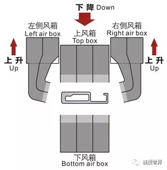为了方便操作,上部风箱和水罩是可以独立升降。当挤第一根铸锭和挤完最后一根铸锭时,上部风箱和水罩升起,方便型材通过淬火装置。当第一根型材前端通过淬火区后,如果是风冷的,就将上部风箱降下来,如果是水冷的,就将上部风箱和水罩一起降下来,利用上水罩和下水箱的闭合防止水珠往外飞溅。同时可根据型材的高度变化进行上部风箱高度的调整,来调节上部风口和喷头与型材顶部之间的距离,减少风压或水压的损失。