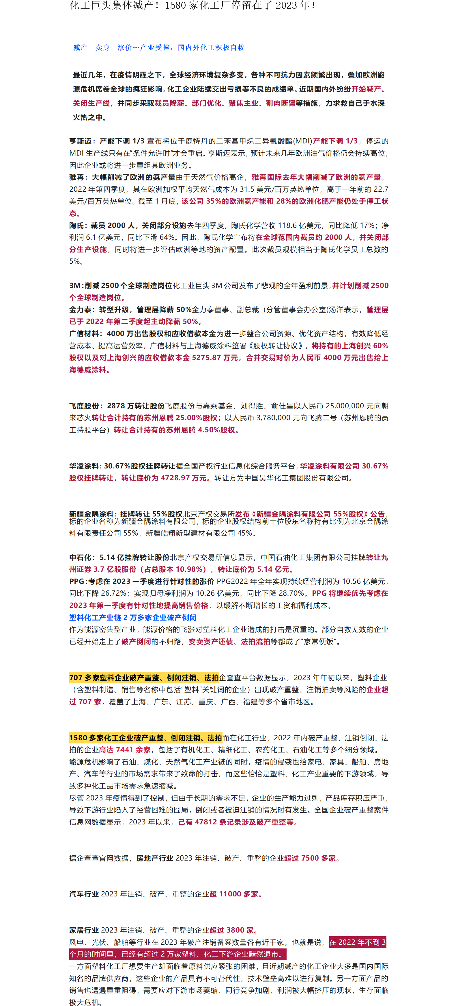 化工巨头集体减产!1580家化工厂停留在了2023年!